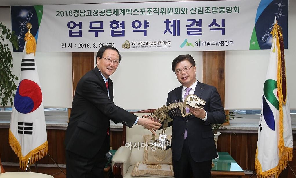산림조합중앙회 이석형 회장은 '2016경남고성공룡세계엑스포'의 성공 개최를 지원하고 고성지역 산림산업 육성과 산림문화 보급을 위해 최평호(경남 고성군수) 2016경남고성공룡세계엑스포 조직위원장과 전략적 업무협약을 25일 체결했다.<br />