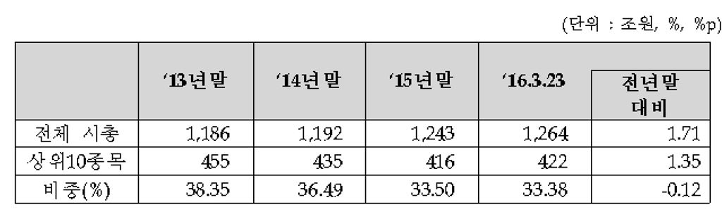[아시아경제 박선미 기자]유가증권시장(코스피) 상위 10개 종목의 시가총액이 전체 시장에서 차지하는 비중이 점차 줄고 있다.28일 한국거래소가 코스피 시총 상위 10개 종목의 변동 현황을 조사한 결과에 따르면 삼성전자, 한국전력, 현대차, 삼성물산, 현대모비스, 삼성전자우, 삼성생명, 아모레퍼시픽, SK하이닉스, NAVER 등의 '톱10' 비중이 33.38%(23일 기준)인 것으로 나타났다. 10개 종목 비중은 2013년 38.35%, 2014년 36.49%. 2015년 33.50%로 매년 감소되고 있다. 코스피 시총 10위권은 최근 기업 실적과 업황에 따라 새로운 진용을 갖췄다. 삼성전자가 매년 부동의 시총 1위 자리를 유지했지만 최근 전력구입비 감소 및 K-뷰티 열풍 등은 시총 상위 10개사 현황 및 순위에도 큰 폭의 변화를 초래했기 때문이다.한국전력은 전력구입비 감소에 따른 순익 증가 등에 힘입어 지난해 말 대비 시총이 5조7135억원(17.8%) 증가해 현대차를 제치고 2위를 차지했다. 현대차는 지난해 순위 2위에서 올해 3위로 밀렸다.화장품 산업의 성장으로 지난해 말부터 아모레퍼시픽이 10위권 안으로 신규 진입했다. 제일모직과 합병한 삼성물산도 10위권에 새롭게 안착했다. 하지만 중국 등 후발업체와의 가격경쟁이 예상되는 POSCO(포스코)는 시총 10위권 밖으로 밀렸다. 삼성SDS도 실적 영향 등에 따라 10위권 밖으로 벗어났다.한편, 코스피 연도별 전체 시총은 2013년 1186조원, 2014년 1192조원, 2015년 1243조원, 2016년 1264조원으로 최근 4년간 연속 증가세를 유지하고 있다. 박선미 기자 psm82@asiae.co.kr<ⓒ세계를 보는 창 경제를 보는 눈, 아시아경제(www.asiae.co.kr) 무단전재 배포금지>