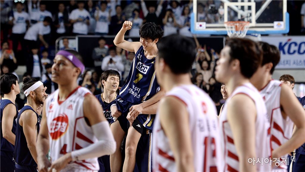 [전주=아시아경제 김현민 기자] 프로농구 전주 KCC와 고양 오리온의 2015~2016시즌 챔피언결정 5차전이 27일 전주실내체육관에서 열렸다. KCC 하승진이 94-88 승리를 확정한 뒤 송교창을 들어 올리며 기뻐하고 있다. 김현민 기자 kimhyun81@asiae.co.kr<ⓒ세계를 보는 창 경제를 보는 눈, 아시아경제(www.asiae.co.kr) 무단전재 배포금지>