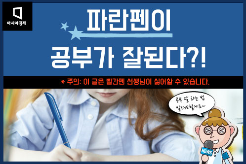 새학기가 시작한 지 어느새 한 달, '열공' 의지가 흔들리고 있다구요? 그럼 이 파란펜 공부법은 어떤가요?와세다 학원 창립자 아이카와 히데키는 '파란펜 쓰기 공부법'을 소개해 화제가 됐습니다. 방법은 생각보다 간단합니다. 파란펜으로 외우고 싶은 단어나 문장을 계속해서 적어서 암기하는 공부방법입니다. 중요한 건 '파란펜' 그런데 왜 파란색일까요? '행동 심리학' 관점에서 파랑이라는 색깔은 흥분 상태를 가라앉히는 진정효과가 있다고 알려져있습니다. 파란색을 보면 뇌의 시상하부가 자극을 받아 세로토닌이라는 호르몬이 분비되기 때문이죠. 2005년 일본 나라 시에서 파란색 가로등을 도입하자 범죄 건수가 21,365에서 2007년 18,299건으로 감소했습니다. 차분하게 공부할 수 있겠죠?다음은 '인상효과' 파란펜으로 공부하면 효과적인 이유는 파랑이라는 색깔이 기억에 남기 쉽기 때문이죠. 보통 공부할 때 사용하는 연필이나 펜은 '검정색' 우리는 평소에 파란색 글자가 가득한 모습은 좀처럼 보기 힘듭니다. '파란색'을 사용하면 이 모습이 인상에 남아 기억력이 향상!파란펜 기억법◆암기하고 싶은 내용을 파란펜으로 쓴다◆펜은 젤이나 투명 타입으로잉크소모가 빨라야 성취감을 빨리 얻을 수 있기 때문이죠.◆다 쓴 펜과 노트는 보관공부성과를 '시각화' 자신감을 부여하고 격려할 수 있죠.그렇다면 오늘부터 공부는 파란펜? 부애리 기자 aeri345@asiae.co.kr이진경 디자이너 leejeen@asiae.co.kr<ⓒ세계를 보는 창 경제를 보는 눈, 아시아경제(www.asiae.co.kr) 무단전재 배포금지>