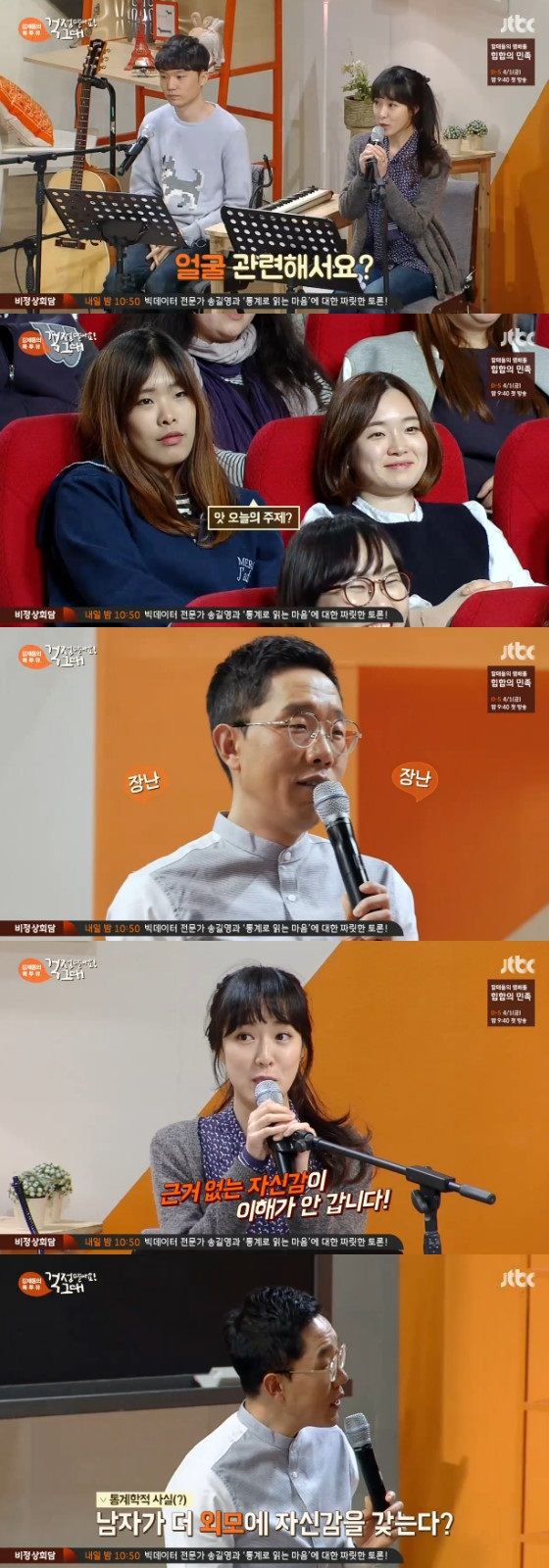[아시아경제 손현진 인턴기자] 가수 요조가 남자들의 외모에 대한 근거 없는 자신감(근자감)이 이해가 되지 않는다고 솔직하게 털어놨다. 27일 오후 방송된 종합편성채널 JTBC '김제동의 톡투유-걱정 말아요 그대'(이하 '톡투유')는 '얼굴'을 주제로 꾸며졌다.이날 김제동은 요조에게 "요조씨는 얼굴하면 무엇이 떠오르냐"고 물었고, 요조는 "얼굴하면 얼굴이 떠오른다"며 무덤덤하게 말했다. 이어 "그럼 이성의 행동 중에 이해 안 가는 것이 있냐"는 김제동의 질문에 요조는 "얼굴 관련해서요?"라고 되물었고 "아니오"라고 답에 요조는 거침없이 "왜요? 얼굴 관련해서도 할 말 있는데"라며 "남자들의 근거 없는 자신감이 이해되지 않습니다"라고 서슴없이 이야기해 웃음을 자아냈다.이를 듣고 있던 기업인 송길영 패널도 "남자들은 거울 보며 자신의 장점을 찾는다"며 "미친거죠"라고 농담해 폭소를 자아냈다. 손현진 인턴기자 freehj@asiae.co.kr<ⓒ세계를 보는 창 경제를 보는 눈, 아시아경제(www.asiae.co.kr) 무단전재 배포금지>