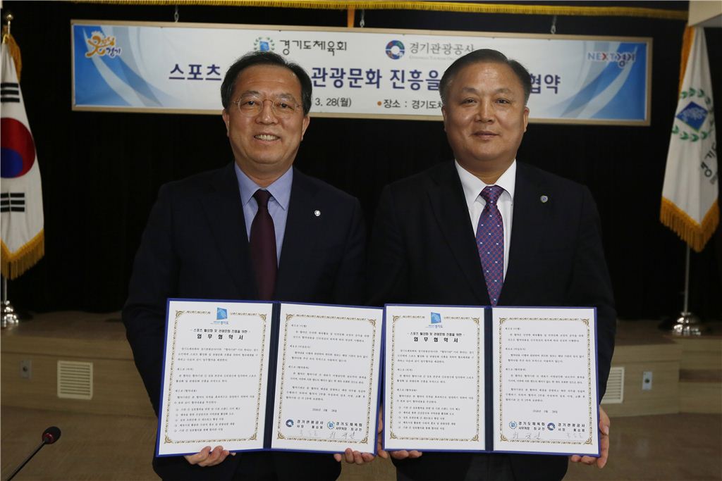 홍승표 경기관광공사 사장(왼쪽)과 최규진 경기도체육회 사무처장이 업무협약을 체결한 뒤 기념사진을 찍고 있다.
