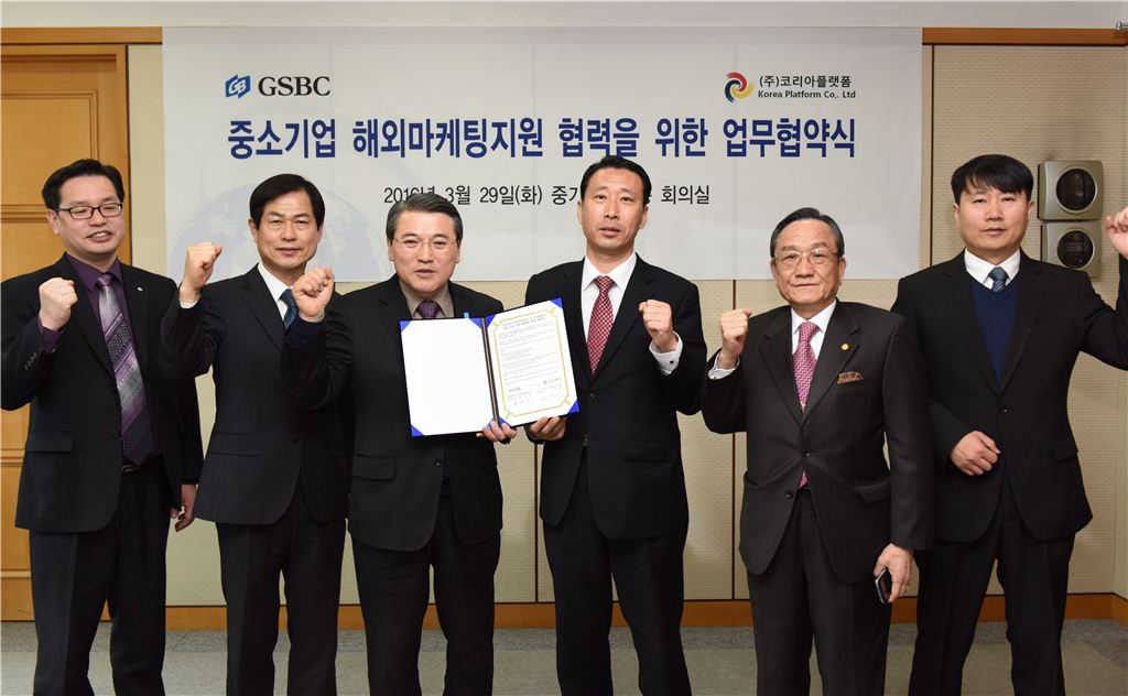 윤종일 경기중기센터 대표(왼쪽 세번째)가 코리아플랫폼과 중소기업 해외마케팅지원 협약을 체결한 뒤 기념촬영을 하고 있다.