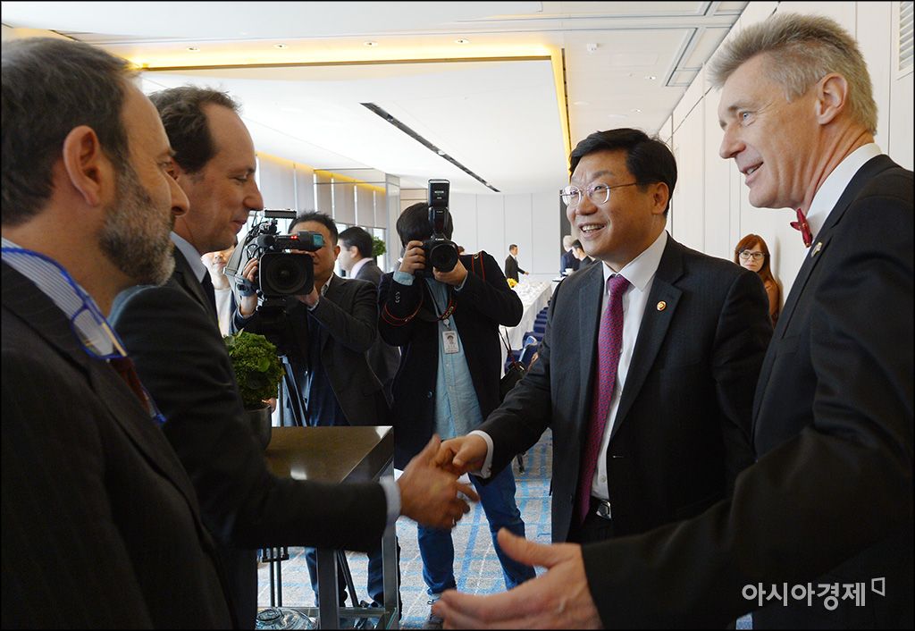 [아시아경제 윤동주 기자] 주형환 산업부 장관이 30일 서울 중구 포시즌호텔에서 열린 EU대사단 오찬간담회에 참석, 주한 EU대사들과 인사를 나누고 있다.윤동주 기자 doso7@asiae.co.kr<ⓒ세계를 보는 창 경제를 보는 눈, 아시아경제(www.asiae.co.kr) 무단전재 배포금지>