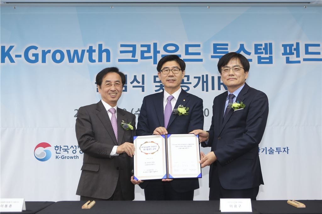 (왼쪽부터) 이동춘 한국성장금융투자운용 대표이사와 이광구 우리은행장, 여주상 마젤란기술투자 대표이사와 30일 서울 역삼동 디캠프(D.Camp)에서 국내 1호 크라우드펀딩 지원펀드인 'K-Growth 크라우드펀드' 출범식을 가진 후 기념촬영을 하고 있다.
