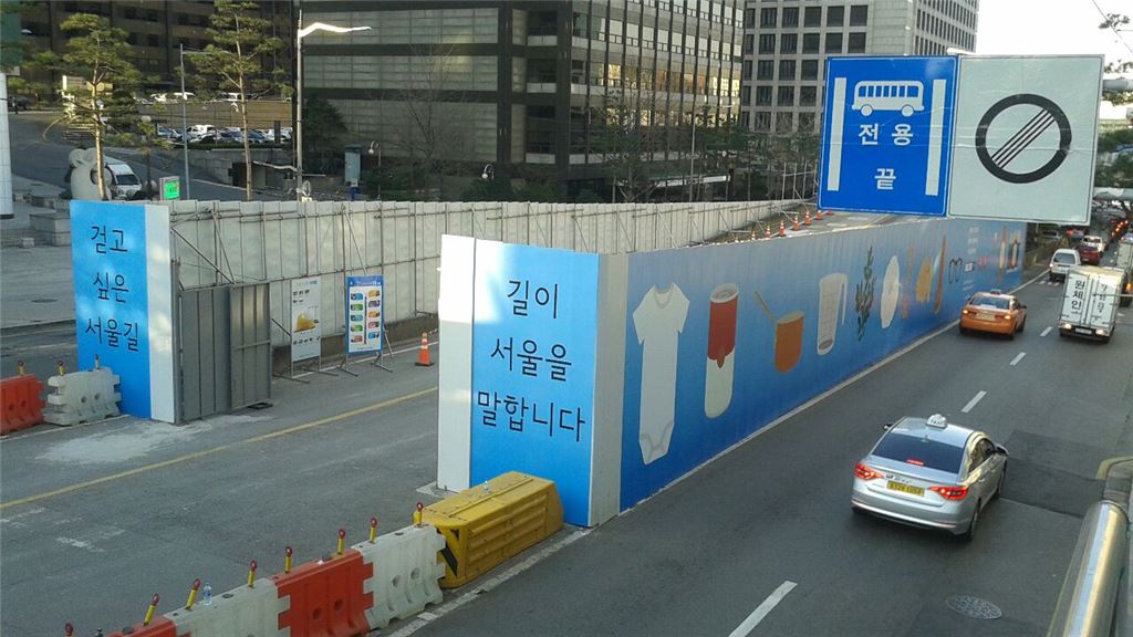 공공디자인이 입혀진 퇴계로 방향 진출입부 가림벽 모습