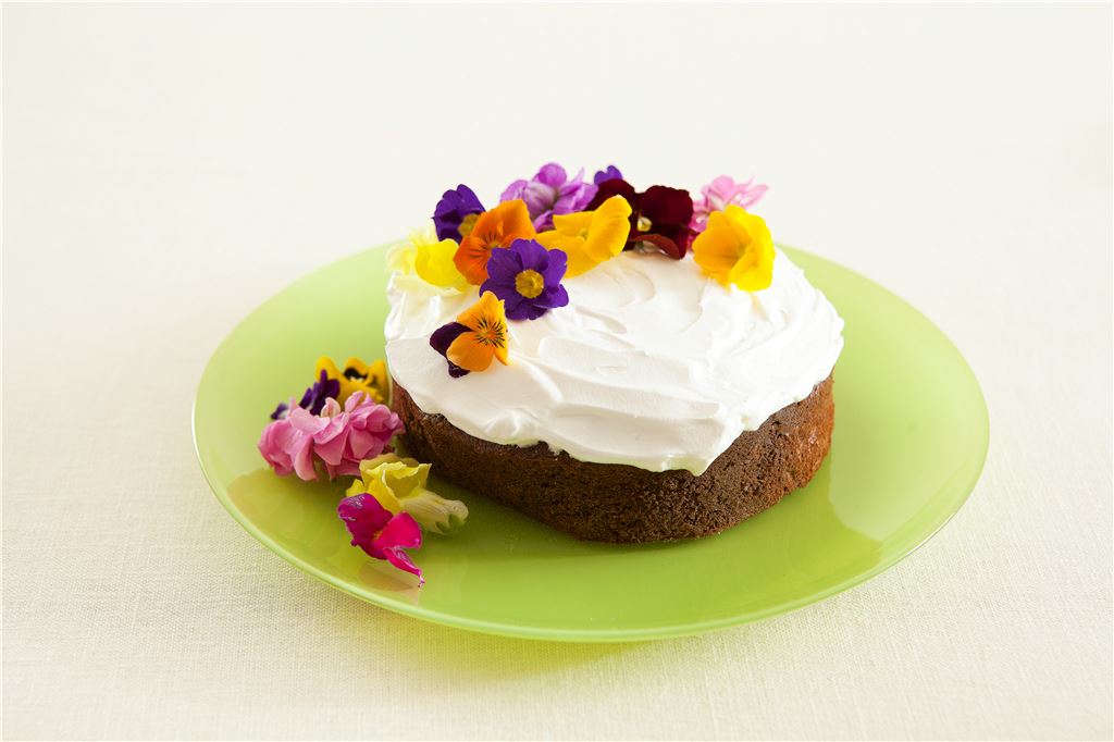 5. 원형틀에 넣어 180℃로 예열한 오븐에서 25~30분 정도 구워 완전히 식혀서 생크림을 거품 내어 바르고 꽃으로 장식한다.<br /> (Tip 장식용 꽃대신 과일을 올려 장식해도 좋다. 장식용 식용 꽃은 백화점 식품코너나 가락시장 특수 채소를 판매하는 곳, 또는 인터넷으로도 구입 가능하다. 생크림은 차가운 상태에서 거품이 잘 나므로 거품을 내기 전까지 냉장고에 차게 보관해 두었다가 거품을 낸다.)<br />