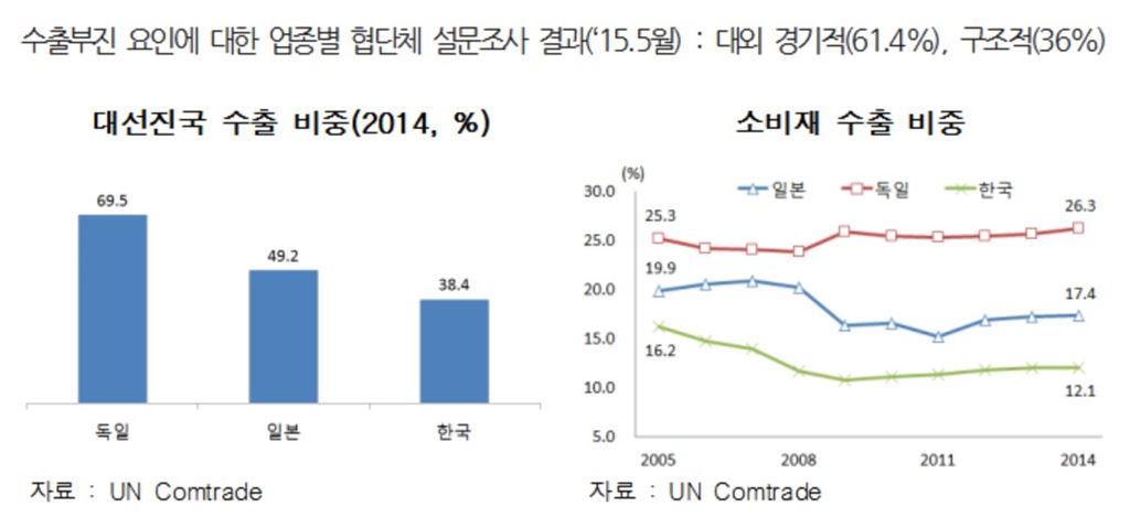 [아시아경제 송화정 기자]우리 수출이 일본과 같은 부진에 빠지지 않으려면 수출 물량 증가세가 지속되고 세계시장 점유율이 상승하고 있는 독일을 벤치마킹해 경쟁력을 확보해야 한다는 분석이 나왔다.한국무역협회 국제무역연구원이 3일 발표한 '일본과 독일의 사례로 본 우리 수출의 시사점' 보고서에 따르면, 1994년 대비 2015년 수출 규모가 독일은 3.11배 증가한 반면, 일본은 1.57배 증가에 그쳐 최근 20년간 독일과 일본의 수출 증가 속도의 격차가 큰 것으로 나타났다.독일이 일본을 크게 앞서는 이유는 유로화 사용으로 역내 수출가격 경쟁력이 제고됐고 상대적으로 낮은 법인세율과 노동개혁으로 기업환경이 개선되면서 해외 생산기지의 본국 회귀와 외국인투자 유치가 확대됐기 때문이다. 또한, 독일이 난민?이민자를 적극 수용해 줄어드는 생산가능인구를 대체한 것도 수출이 증가한 중요한 요인이라고 보고서는 분석했다. 반면 일본은 소극적인 대외개방과 해외생산의 확대, 경직된 이민정책에 따른 노동력 부족, 신흥국·중간재 중심의 수출구조 등이 수출규모 둔화세의 원인으로 지적됐다.대외 경기적 요인에 의해 2012년부터 한 자리수의 증가세에 머무르고 있는 한국 수출도 일본과 같이 주력 수출산업의 해외생산 비중과 중국 등 신흥국에 대한 수출의존도가 높은 모습이다. 이러한 구조적인 요인이 장기화될 경우 우리 수출의 회복이 지연될 가능성도 있을 것으로 예상된다.따라서 우리 수출도 독일의 성공사례를 벤치마킹해 고급 부품소재와 소비재 산업을 육성해 선진국에 대한 수출을 확대해야 하는 한편, 노동시장 구조개혁과 외국인 노동자를 수용하려는 사회적 합의와 정책적 노력이 요구된다고 보고서는 주장했다.문병기 국제무역연구원 수석연구원은 "노동시장 개혁, 법인세 인하 등을 통해 독일이 해외공장의 본국 리턴을 해 왔듯이 우리나라도 국내기업 환경을 개선해 생산의 국내화를 강화해야 한다"면서 "환태평양경제동반자협정(TPP) 등 메가 자율무역협정(FTA)도 적극 참여해 시장개방과 구조개혁의 기회로 활용해야 한다”고 강조했다.송화정 기자 pancake@asiae.co.kr<ⓒ세계를 보는 창 경제를 보는 눈, 아시아경제(www.asiae.co.kr) 무단전재 배포금지>