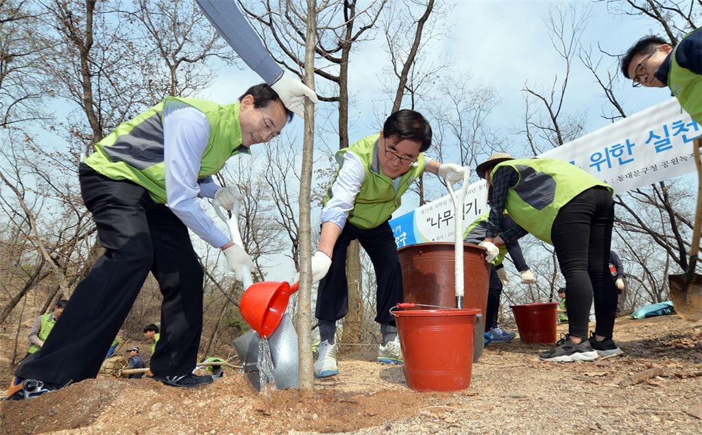 [아시아경제 박종일 기자] 동대문구(구청장 유덕열)는 제71회 식목일을 맞아 1일 오후 2시 배봉산공원에서 ‘2016년 동대문구 나무심기 행사’를 개최했다. ‘나무심기, 녹색미래를 위한 실천’ 이라는 주제의 행사에는 구청 도시관리국 직원 등 100여명이 참석해 밤나무, 산수국, 산철쭉 등 430주의 나무를 심었다.