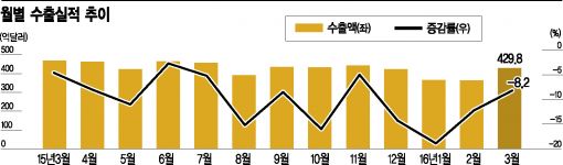 [아시아경제 조슬기나 기자]지난달 우리나라 수출 감소폭이 4개월만에 한 자릿수로 개선되며 수출 부활에 대한 기대가 커지고 있다. 그러나 향후 '기저효과의 덫'을 조심해야 한다는 우려의 목소리가 높다. 저유가와 수출감소세가 본격화 된 지 일년여를 넘어서며, 실제 경제상황과 달리 전년 대비 지표만 화려한 개선세를 나타낼 수 있는 요건이 마련됐기 때문이다.특히 우리 수출의 25%를 책임지는 중국의 경기 부진 등 하방위험요인이 여전하다는 점에서 오히려 '기저효과에 따른 낙관론'이 오히려 경제를 악화시킬 수 있다는 지적도 나온다.정부 고위관계자는 4일 "3월에 이어 4월에도 갤럭시S7 등 신제품 효과, 국제유가 상승세 반영 효과로 수출이 개선될 것"이라며 "아직 '회복'을 말할 단계는 아니지만 개선세를 이어가고 있음은 확실하다"고 말했다.