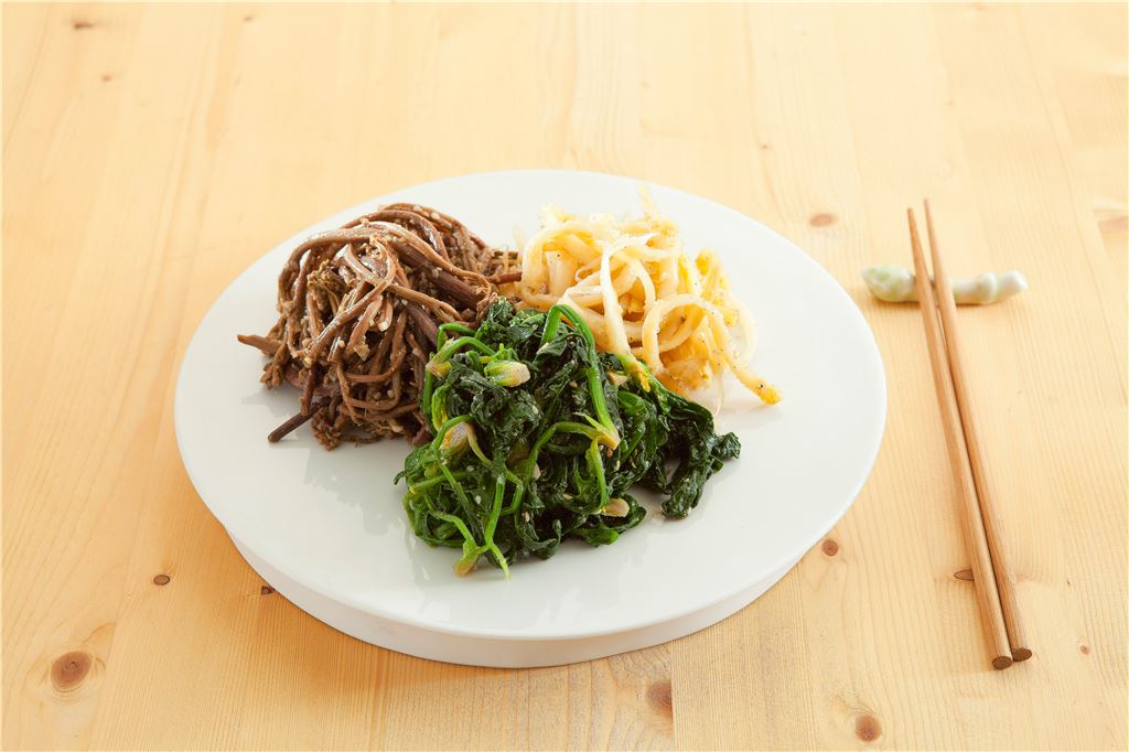 주재료(2인분)고사리 200g, 도라지 150g, 시금치 200g, 소금 약간고사리 양념국간장 2, 다진 파 1, 다진 마늘 0.5, 들기름(또는 참기름) 2, 물 4, 깨소금 1도라지 양념 소금 0.2, 다진 파 1, 다진 마늘 0.5, 참기름 2, 깨소금 1, 물 4시금치 양념 국간장 0.5, 소금 약간, 참기름 2, 깨소금 1만들기▶ 요리 시간 30분1.고사리는 줄기 쪽의 딱딱한 것을 끊어낸 후 양념한다.<br />