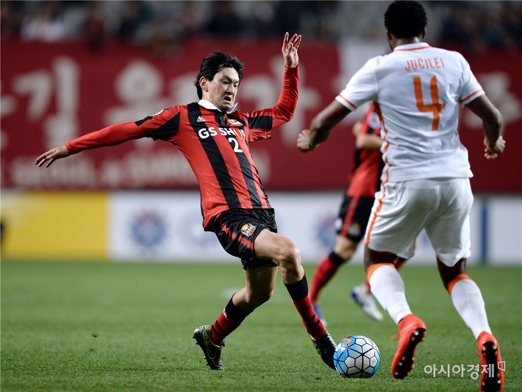 [상암=아시아경제 김현민 기자]2016 AFC 챔피언스리그(ACL) FC서울과 산둥 루넝(중국)과의 조별리그 4차전이 5일 서울월드컵경기장에서 열렸다. 서울 다카하기가 상대와 공을 다투고 있다. 김현민 기자 kimhyun81@asiae.co.kr<ⓒ세계를 보는 창 경제를 보는 눈, 아시아경제(www.asiae.co.kr) 무단전재 배포금지>