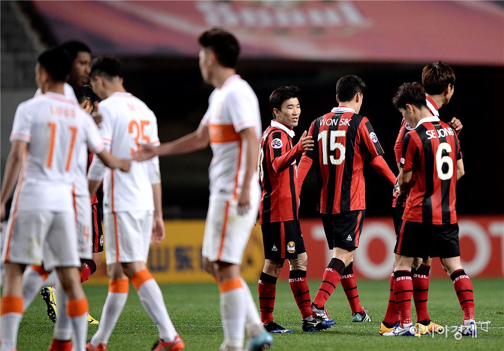 [상암=아시아경제 김현민 기자]2016 AFC 챔피언스리그(ACL) FC서울과 산둥 루넝(중국)과의 조별리그 4차전이 5일 서울월드컵경기장에서 열렸다. 서울 선수들이 0-0 무승부로 경기를 마치고 있다. 김현민 기자 kimhyun81@asiae.co.kr<ⓒ세계를 보는 창 경제를 보는 눈, 아시아경제(www.asiae.co.kr) 무단전재 배포금지>