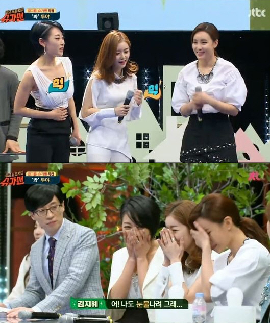 [아시아경제 강현영 인턴기자] 걸그룹 투야가 15년만에 모여 무대를 꾸몄다. 5일 방송된 JTBC '투요 프로젝트-슈가맨'에는 유재석팀 슈가맨으로 그룹 투야가 출연했다.이날 방송에서 투야는 히트곡 '봐'를 부르며 추억의 무대를 선사한 후 "해체 후 15년 만에 무대에 섰다"며 "오랜만에 무대를 서니 관절이 말을 안듣는다"고 소감을 전해 웃음을 자아냈다. 멤버 류은주는 "결혼 11년 됐다"고, 김지혜는 "결혼 3년차다"고 근황을 전했다. 안진경은 "지점장으로 근무하고 있고 아직 솔로다"라고 덧붙였다.투야는 과거 활동 당시에 대해 "소속사가 힘들어졌다. 점점 댄서들이 사라지고 메이크업도 우리가 손수 해야 했다"고 어려웠던 상황을 회상하며 눈물을 보이기도 했다. 강현영 인턴기자 youngq6@asiae.co.kr<ⓒ세계를 보는 창 경제를 보는 눈, 아시아경제(www.asiae.co.kr) 무단전재 배포금지>