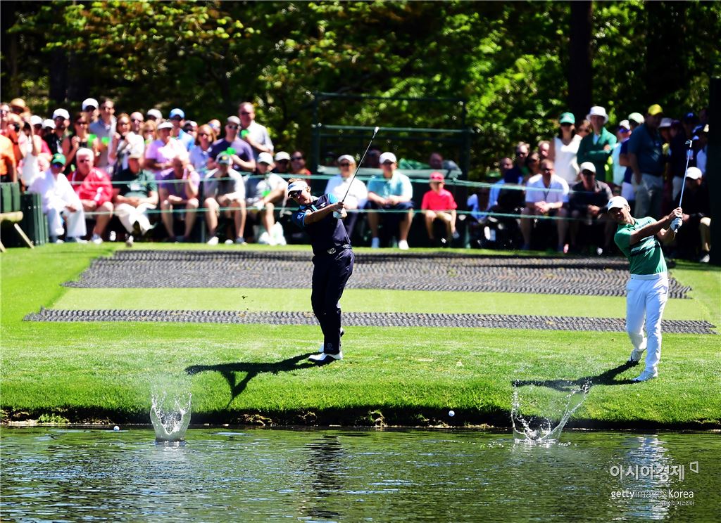 [아시아경제 노우래 기자] ○…"물 수제비 뜨기 보세요."폴 케이시(오른쪽)와 이안 폴터(이상 잉글랜드)가 6일(한국시간) 미국 조지아주 오거스타의 오거스타내셔널골프장(파72ㆍ7435야드)에서 열린 연습라운드 도중 16번홀(파3)에서 물을 향해 티 샷을 하고 있다. 연습라운드에 몰린 구름 갤러리를 위한 팬 서비스다. 케이시는 7일 밤 10시48분 디펜딩챔프 조던 스피스, 브라이슨 디챔버(이상 미국)와 함께, 폴터는 약 1시간 뒤인 11시44분 버바 왓슨(미국), 브랜든 그레이스(남아공)와 1라운드를 출발한다. 노우래 기자 golfman@asiae.co.kr<ⓒ세계를 보는 창 경제를 보는 눈, 아시아경제(www.asiae.co.kr) 무단전재 배포금지>