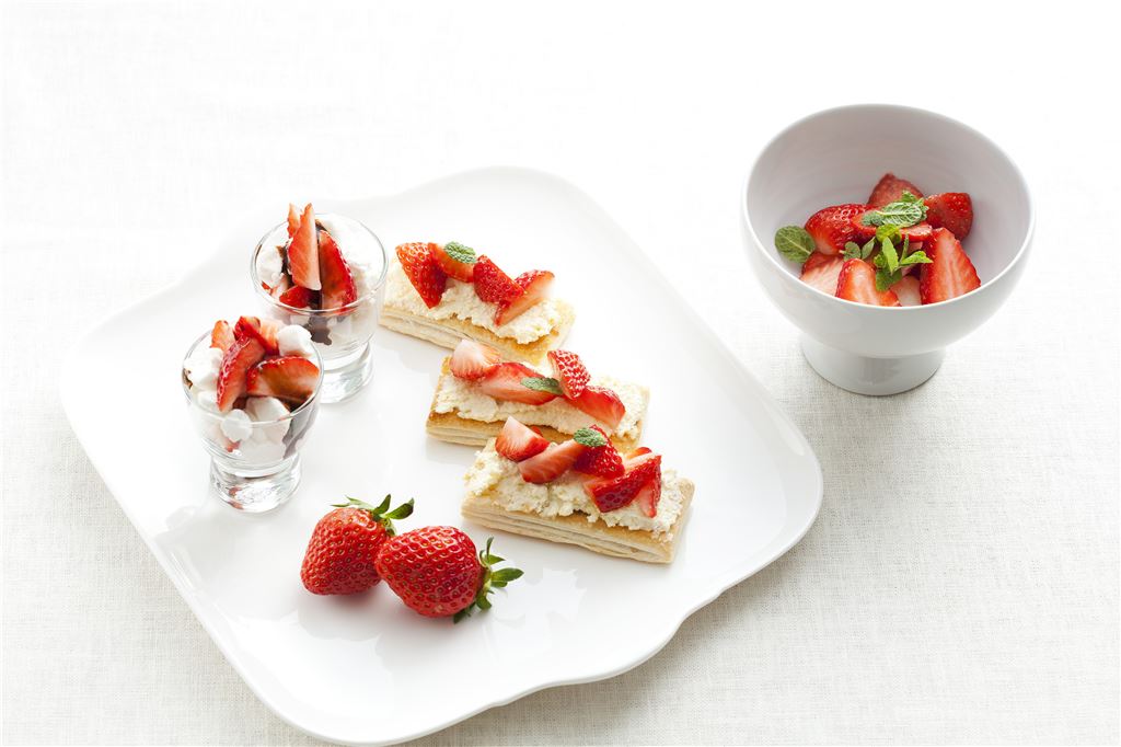 2. 프렌치파이 위에 크림치즈를 넉넉히 바르고 딸기를 장식한다.<br /> (Tip 수제치즈를 이용해도 좋고 프렌치파이 대신 크래커나 식빵 등을 이용해도 된다.)<br />