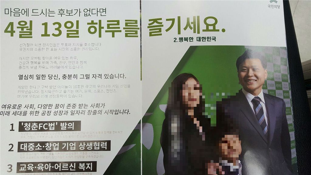 [아시아경제 이종윤 인턴기자] '마음에 드는 후보가 없다면 4월13일 하루를 즐기세요'20대 국회의원 선거 '안양 만안구'에 출마하는 곽선우 국민의당 후보의 선거 홍보물 내용이다.이와 더불어 홍보물 내용에는 '선거철 정치인들은 투표와 지지율을 호소한다"며 "모처럼 찾아온 여유 있는 하루, 즐겁게 보낼 자유도 여러분에게 있다"고 적시돼 있다.하지만 이를 본 네티즌들은 "선거날 투표하지 말고 놀러가라는 이야기인가" "새누리 2중대인가" "민주주의 정당에서 할 소리인가" "야권후보가 투표포기 조장이라니" "이런게 국민의당의 새정치?" 등 비난의 목소리가 잇따랐다.더불어 민주당도 6일 현안 브리핑을 통해 "투표포기를 선동한 곽 후보의 공보물을 본 많은 주민들이 눈살을 찌푸리고 있다"며 "민생을 살리기 위한 투표참여를 독려해도 모자랄 판에 투표포기를 선동했다. 개탄을 금할 수 없다"고 비판했다. 해당 홍보물 논란이 확산되자 곽 후보의 선거사무장은 한 매체와의 통화에서 "글의 맥락을 살펴보면 투표 포기를 조장하는 것이 아니라 투표를 독려하는 내용"이라면서 "일부의 주장은 명백한 흑색선전이다"이라고 말했다. 이종윤 인턴기자 yagubat@asiae.co.kr<ⓒ세계를 보는 창 경제를 보는 눈, 아시아경제(www.asiae.co.kr) 무단전재 배포금지>