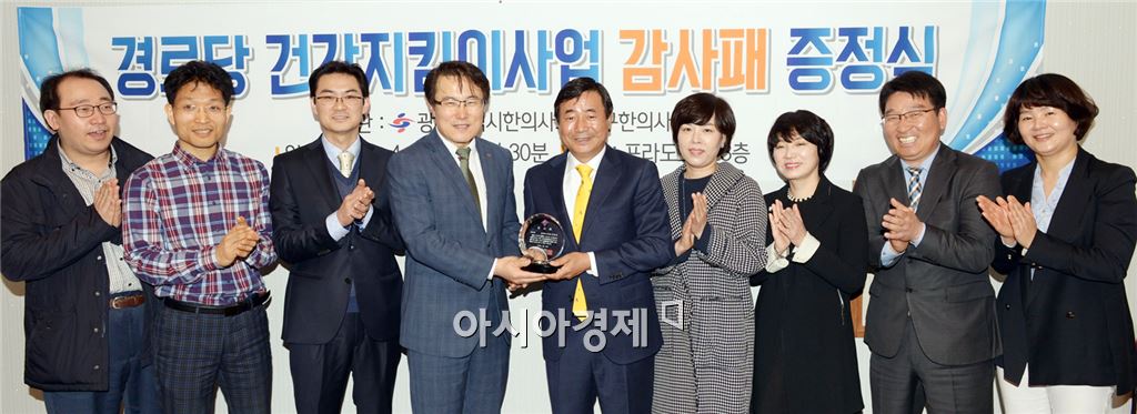 최영호 광주시 남구청장이 7일 백운동 프라도호텔에서 열린 ‘경로당 건강지킴이 사업 기여 감사패 수여식’에서 안수기 광주시 한의사회장으로부터감사패를 받고 기념촬영을 하고있다.<br />