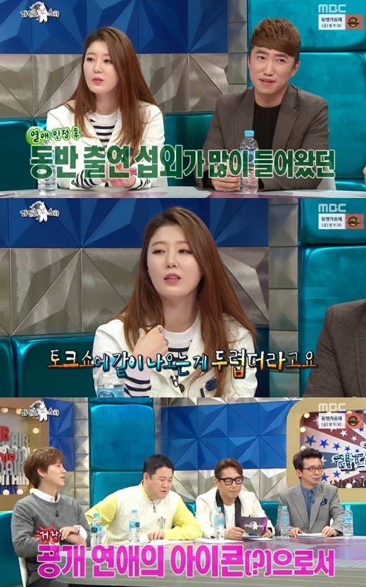 [아시아경제 강현영 인턴기자] 가수 나비가 연인인 개그맨 장동민과의 방송 출연에 대해 생각을 밝혔다.6일 방송된 MBC '라디오스타'에는 나비가 개그맨 트리오 옹달샘 장동민 유세윤 유상무와 함께 출연해 '옹달샘에 빠진 나비' 특집을 꾸몄다.이날 나비는 "장동민과 제가 방송에서 열애를 스스로 밝힌 경우가 아니냐"며 "그렇게 공개하고 나니 동반 출연 섭외가 많이 들어오더라. 그런데 토크쇼에 나오는 게 두렵더라"고 털어놨다.그러더니 "이제 피하지 않고 '공개 연애'의 아이콘으로서 당당하게 하려고 한다"고 포부를 말했다.한편 이날 '라디오스타'에서는 나비와 장동민의 첫키스 일화가 공개되는 등 솔직한 입담을 선보여 네티즌들의 관심을 모으고 있다. 강현영 인턴기자 youngq6@asiae.co.kr<ⓒ세계를 보는 창 경제를 보는 눈, 아시아경제(www.asiae.co.kr) 무단전재 배포금지>