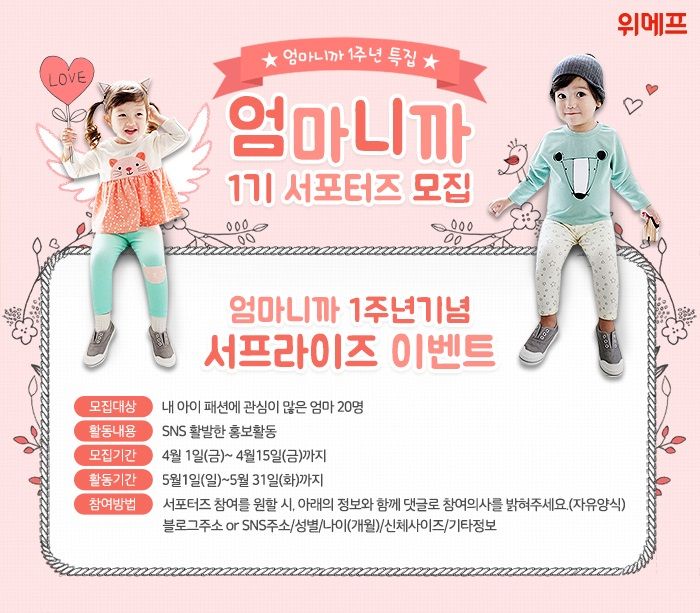 [아시아경제 조강욱 기자] 소셜커머스 위메프(대표 박은상)는 오는 15일까지 '엄마니까 서포터즈' 1기를 모집한다고 7일 밝혔다. 엄마니까 서포터즈는 내달 1일부터 31일까지 SNS를 통해 '엄마니까' 홍보 활동을 수행하게 된다. 서포터즈 20명에게는 내 아이를 위한 풀코디 시크릿박스를 기간 중 2회 제공한다. 또한 선발된 20명 중 활동 우수자를 뽑아 소정의 추가 선물을 증정한다. '엄마니까'는 2030 주부 고객들을 위해 다양한 유아동 패션상품을 매일 00시에 오픈하고 무료배송으로 특가에 판매하는 상시 기획전이다.내 아이 패션에 관심이 많은 엄마라면 누구나 지원할 수 있으며, 참여방법은 블로그주소 또는 SNS주소와 아이의 성별, 나이(개월), 신체사이즈와 기타정보를 댓글로 남겨 참여의사를 밝히면 된다. 참여 혜택으로 참여 응모자 중 100명을 추첨해 1000포인트를 증정한다.자세한 내용은 위메프 홈페이지 내 유아동패션 카테고리에서 확인 가능하고 최종합격자 발표는 4월 19일에 발표될 예정이다.조강욱 기자 jomarok@asiae.co.kr<ⓒ세계를 보는 창 경제를 보는 눈, 아시아경제(www.asiae.co.kr) 무단전재 배포금지>
