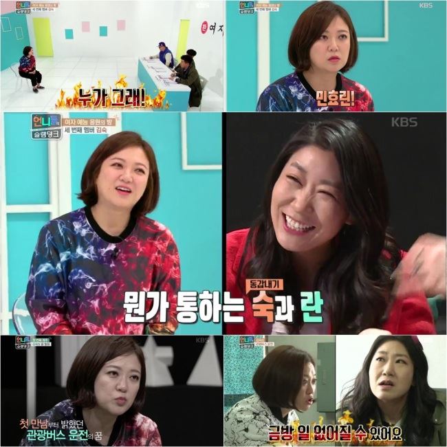 [아시아경제 김원유 인턴기자]김숙이 '언니들의 슬램덩크'에서 '갓숙'이라는 별명에 맞는 카리스마를 선보였다.8일 저녁 KBS2 '언니들의 슬램덩크' 첫 방송에는 김숙을 필두로 라미란, 홍진경, 민효린, 제시, 티파니가 출연했다.김숙은 평소 시원시원한 성격으로 시청자들의 호응을 얻어왔다. 특히 여성팬들의 높은 지지로 이어져 '걸크러쉬'를 이끌어냈다.김숙은 어린 시절 자신의 눈에 띄었던 것은 관광버스 기사 아저씨였다며, 개그우먼의 꿈을 심어준 관광버스 운전에 도전하고 싶다고 말해 뭉클한 감동을 선사했다.이에 제시, 티파니는 김숙과 운전학원에 가서 관광버스 운전 교육을 등록했고 라미란과 홍진경, 민효린은 김숙의 운전을 도와줄 멘토를 찾아 나섰다.한편 '언니들의 슬램덩크'는 1회 전국 5.2%의 시청률(닐슨코리아)을 기록했다. 이전 프로그램인 '인간의 조건-집으로'의 마지막 회 시청률 2.7%보다 무려 2.5%포인트 상승한 수치다.김원유 인턴기자 rladnjsdb@asiae.co.kr<ⓒ세계를 보는 창 경제를 보는 눈, 아시아경제(www.asiae.co.kr) 무단전재 배포금지>