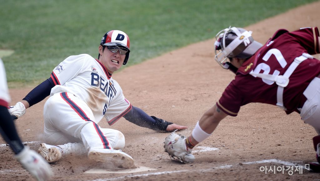 [잠실=아시아경제 김현민 기자] 프로야구 넥센 히어로즈와 두산 베어스의 2016 KBO리그 경기가 10일 서울 잠실구장에서 열렸다. 4회말 2사 만루에서 두산 정수빈의 유격수 내야안타 때 2루주자 김재호가 홈으로 쇄도해 득점하고 있다. 김현민 기자 kimhyun81@asiae.co.kr<ⓒ세계를 보는 창 경제를 보는 눈, 아시아경제(www.asiae.co.kr) 무단전재 배포금지>