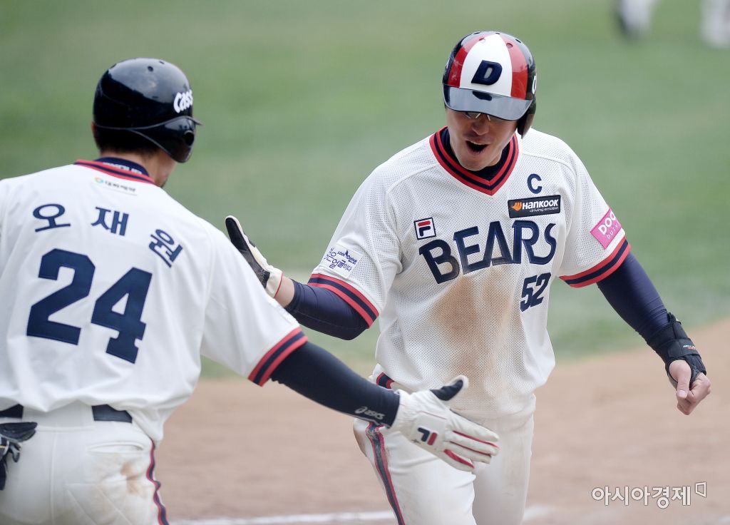 [잠실=아시아경제 김현민 기자] 프로야구 넥센 히어로즈와 두산 베어스의 2016 KBO리그 경기가 10일 서울 잠실구장에서 열렸다. 4회말 2사 만루에서 두산 정수빈의 유격수 내야안타 때 2루주자 김재호가 홈으로 쇄도해 득점한 뒤 선행주자 오재원과 기뻐하고 있다. 김현민 기자 kimhyun81@asiae.co.kr<ⓒ세계를 보는 창 경제를 보는 눈, 아시아경제(www.asiae.co.kr) 무단전재 배포금지>