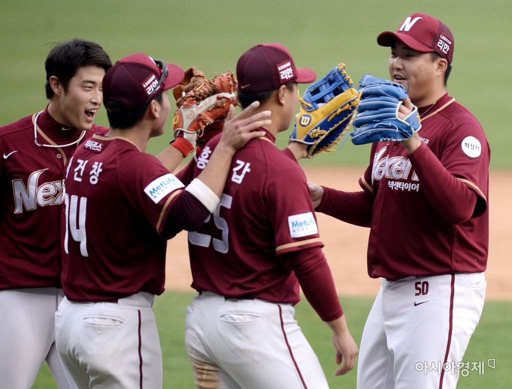 [잠실=아시아경제 김현민 기자] 프로야구 넥센 히어로즈와 두산 베어스의 2016 KBO리그 경기가 10일 서울 잠실구장에서 열렸다. 넥센 마무리 김세현이 팀의 5-4 승리를 확정한 뒤 동료들과 기뻐하고 있다. 김현민 기자 kimhyun81@asiae.co.kr<ⓒ세계를 보는 창 경제를 보는 눈, 아시아경제(www.asiae.co.kr) 무단전재 배포금지>
