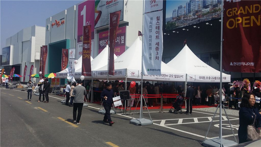 세종힐스테이트 3차 견본주택 입구에 줄지어 선 방문객들이 입장 순서를 기다리고 있다.