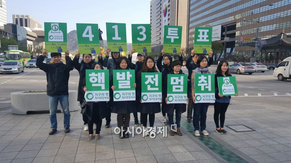 환경운동연합 회원과 활동가들이 광화문광장 앞에서 '4·13 투표'와 '핵 발전 중단'이라고 적힌 피켓을 들고 캠페인을 하고 있다.