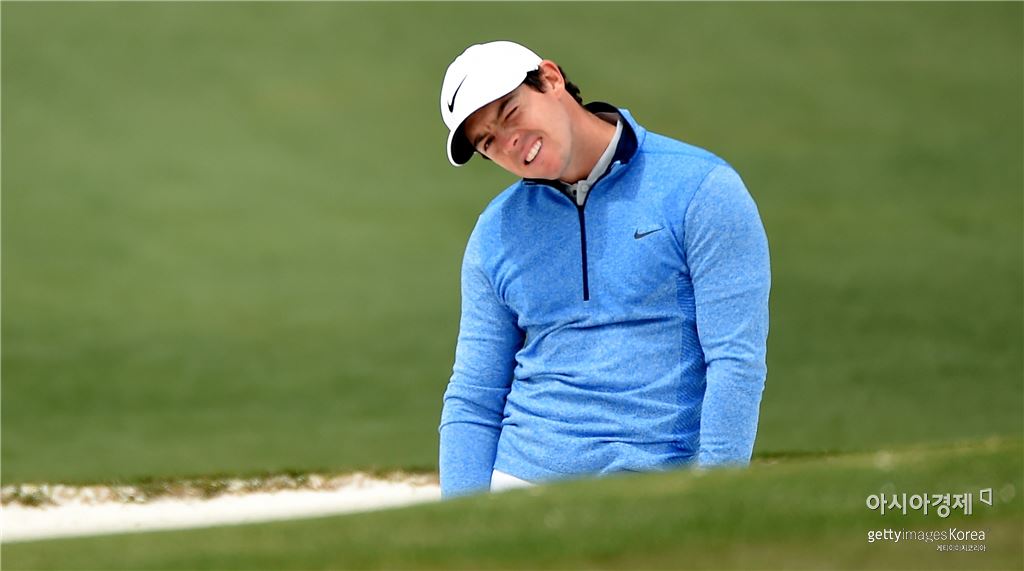 로리 매킬로이가 마스터스 최종일 2번홀에서 벙커 샷을 한 뒤 실망스러운 표정을 짓고 있다. 오거스타(美 조지아주)=Getty images/멀티비츠