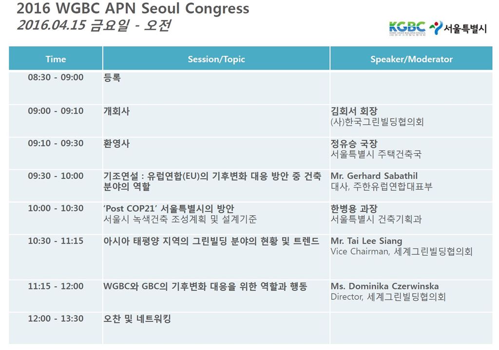 [아시아경제 조은임 기자]아시아-태평양 지역의 녹색건축 전문가들이 오는 15일 서울서 온실가스 감축을 위한 건물분야의 역할과 중요성을 논의한다. 화석에너지 사용 과 탄소 배출을 없애고 패시브 건축, 제로에너지 건물, 신재생에너지 도입 등을 신성장 동력으로 삼을 수 있도록 건설산업의 패러다임을 전환하기 위해서다. 12일 서울시에 따르면 '2015 세계그린빌딩협의회(WGBC) 아시아-태평양 네트워크(APN) 회의'가 오는 15일 서울시청 신청사에서 열린다. 한국그린빌딩협의회(KGBC) 주관으로 개최되는 이 회의에는 아시아-태평양 국가들의 그린빌딩협의회를 비롯한 국내외 전문가들이 참여한다.<br />