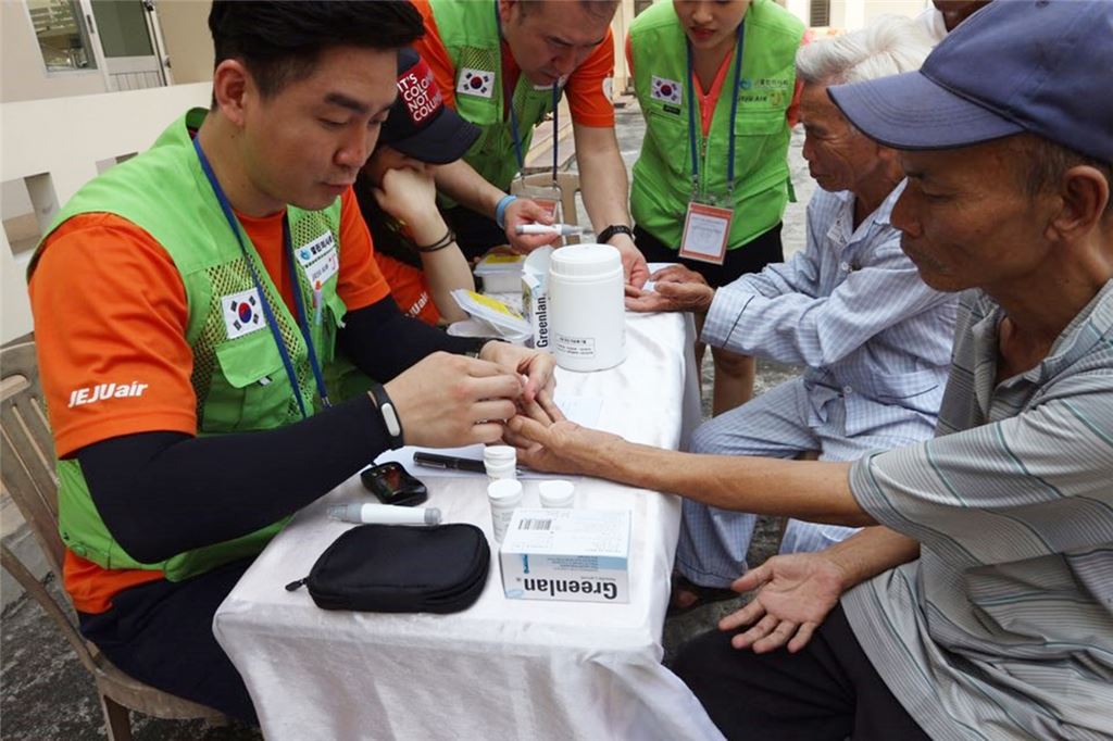 제주항공과 열린의사회가 베트남 다낭의 꽝남성에서 공동으로 실시한 의료봉사에서 봉사단들이 현지주민에게 치료를 해주고 있다.<br />