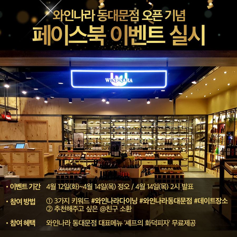 [아시아경제 이주현 기자]아영FBC가 와인나라 동대문점 오픈 기념 페이스북 이벤트를 진행한다고 12일 밝혔다. 이번 이벤트는 더 많은 소비자들이 와인을 즐기고 문화생활을 향유할 수 있도록 새로운 콘셉트의 와인나라 동대문점 오픈을 기념해 기획됐다. 이벤트는 아영FBC 공식 페이스북에서 진행되며, #와인나라다이닝 #와인나라동대문점? #데이트장소 3가지 키워드의 해시태그와 함께 가고 싶은 친구를 태그하면 참여 가능하다. 이벤트 일정은 12일부터 14일까지 1차 진행되며, 2차는 19일부터 21일까지다. 담청자 발표는 14일과 21일 두 차례에 걸쳐 진행되며 회차 별로 10명씩 총 20명을 선정한다. 최종 선정된 20명에게는 와인나라 동대문점의 대표메뉴인 ‘셰프의 화덕피자’를 무료로 제공한다. 와인나라 동대문점은 일본이나 프랑스의 따스뜨뱅처럼 소매점과 레스토랑이 함께 있는 형태로 와인을 할인점 가격에 구매해 레스토랑에서 코르크 차지없이 마실 수 있는 것이 특징이다. 국가별, 품종별로 다양하게 와인을 구비하고 다이닝 담당 셰프가 제철 재료를 이용해 8000원 대에서부터 2만원 대의 가성비 높은 메뉴를 선보인다. 운영시간은 일요일에서 수요일까지 오전 11시에서 오후 10시, 목요일에서 토요일은 오전 11시에서 오후 11시까지다. 아영FBC 관계자는 “와인 애호가들은 물론 와인을 처음 접하는 고객들이 쉽고 편하게 와인을 즐길 수 있는 공간을 확대하고자 복합 매장을 오픈했다”라며 “앞으로 와인나라 동대문 점을 방문하는 고객이 늘 수 있도록 페이스북 이벤트를 비롯한 풍성한 이벤트를 선보일 계획”이라고 밝혔다.이주현 기자 jhjh13@asiae.co.kr<ⓒ세계를 보는 창 경제를 보는 눈, 아시아경제(www.asiae.co.kr) 무단전재 배포금지>