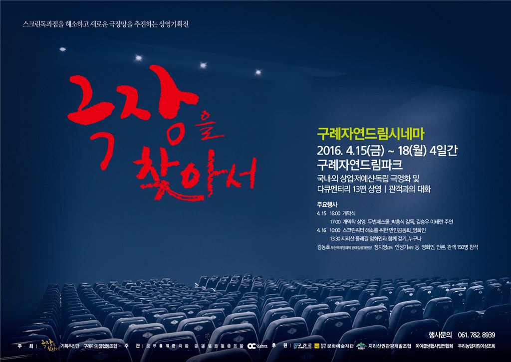 "국내·외 극영화 및 다큐멘터리 ‘극장을찾아서’13편 상영""15일부터 18일까지,스크린독과점 해소를 위한 영화인·영화공동체 포럼 "[아시아경제 이진택 기자]스크린독과점 개선의 취지에 공감하는 영화인들(극장을 찾아서 기획추진단)이 스크린독과점 해소방안을 모색하는 상영행사 ‘극장을찾아서’를 기획 4월 15일부터 18일까지 4일간 구례자연드림파크 내 구례자연드림시네마에서 처음 행사를 연다. 15일 개막식에서는 영화인 핸드프린팅 및 구례북중학교 난타팀의 축하공연 후 중년의 사랑을 다룬 ‘두 번 째 스물’(박흥식감독, 20회부산국제영화제 초청작)을 개막작으로 상영한다. 극장을찾아서기획추진위원단 위원장인 정지영(감독) 등 영화 감독, 배우, 제작자 등 영화인과 영화단체, 언론, 관객, 지역주민 등 150여명이 참석할 예정이다. 상영프로그램에서는 지리산을 무대로 한, 특별상영작 ‘남부군’(정지영감독,안성기·이혜영·최진실·최민수 출연)과 칠레 탄광매몰 구조 실화를 다룬 '33'(패트리샤 리건 감독, 안토니오 반데라스·줄리엣 비노슈 출연) 등 국내·외 저예산·독립·예술·상업 극영화와 다큐멘터리 총 13편을 18일까지 상영하고 관객과의 대화(3회)도 함께 진행한다.상영전 외 ‘스크린독과점 해소를 위한 만민공동회’ 및 ‘영화공동체 네트워크 포럼’을 진행하며, 관객 지역주민과 영화인이 함께 지리산 둘레길을 걷고, 영화공동체와 지역 문화예술인이 참여하는 구례문화예술인의 밤 등 관련 행사가 이어진다. 특히, 영화 각계가 참여하는 포럼에서는 스크린독과점 규제법안에 대한 쟁점과 의견을 모으고, 독과점 해소의 현실적 방안으로서 대안상영관과 영화공동체를 함께 연결하는 새로운 극장망의 가능성을 모색하는 논의를 진행한다.‘극장을찾아서’는 배급시장의 독과점 수위가 심각해지는 상황(검사외전 경우 최대 1,807개, 전체상영관 수의 78% 점유)을 지속적이고 실제적으로 해소해가고자 이후 작은상영관, 미디어센터, 지역아트홀, 대학강당 등 상영시설을 갖춘 대안상영공간을 돌며 상영전을 이어갈 계획이다. 극장이 걸지 않거나, 극장을 얻지 못한 영화들을 대안상영관에서 상영하므로 영화콘텐츠 수급의 불균형을 해소하고 관람선택권을 회복하며, 상영가능한 공간들을 연결하는 새로운 극장망의 추진을 모색한다. 상영전의 관람요금은 6,000원, 예매는 인터파크(//movie.interpark.com/Movie/) 에서 가능하며 단체관람(10명이상/4,500원)은 사전에 전화로 예약해야 한다. 구례자연드림시네마 사이트(//www.naturaldreampark.co.kr/movie.html)에서도 상영에 관한 상세정보를 확인할 수 있다. 관람문의= (061)783. 8993/782. 8939 이진택 기자<ⓒ세계를 보는 창 경제를 보는 눈, 아시아경제(www.asiae.co.kr) 무단전재 배포금지>
