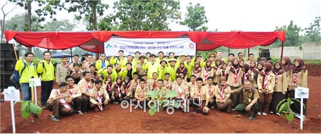 지속적 우호 증진 통한 안정적 조림지 확보[아시아경제 문승용] 산림조합중앙회(회장 이석형)는 3월 29일부터 4월 2일까지 3박 5일 일정으로 한·인니간 산림협력 MOU에 근거해 추진되고 있는 인니 해외 조림사업의 성공과 인니 국영 영림공사와의 지속적인 우호증진을 도모하기 위한 기념행사와 현지 점검 행사를 가졌다. 이번 인니 해외조림지 행사는 인니 서부 자바주 2011년도 티크 조림지를 대상으로 실시됐으며 이석형 중앙회장을 비롯한 중앙회 이사 조합장과 전문이사, 대의원 조합장등 20여명이 참가했다. 또한 현지 점검 행사에는 인니 국영 영림공사 관계자를 비롯한 지역주민, 학생등 약300여명이 참석했다.산림조합의 해외산림자원 개발은 1994년 베트남 제지연합회와 합작회사 설립을 시작으로 단독법인인 산림조합 비나(Sanrimjohap Vina Co., Ltd.)를 통한 독자적인 베트남 해외산림자원개발 사업을 추진하고 있다.인니 남부 반둥 반자란 커피 조림지에서 지역민과 함께 기념촬영을 하고 있다. 사진=산림조합중앙회