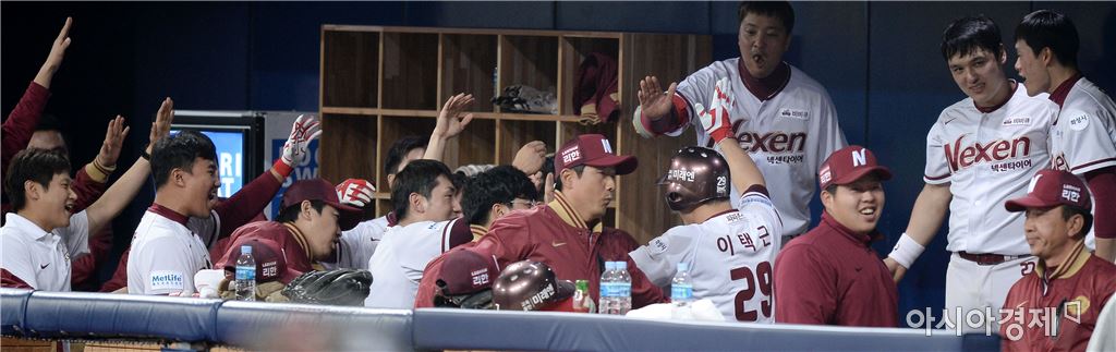 [고척돔=아시아경제 김현민 기자] 프로야구 kt 위즈와 넥센 히어로즈의 2016 KBO리그 경기가 12일 서울 양천구 고척스카이돔에서 열렸다. 6회말 무사 1루에서 넥센 이택근이 kt 선발 밴와트를 상대로 좌월 추가 투런 홈런을 치고 더그아웃의 동료들과 하이파이브하고 있다. 김현민 기자 kimhyun81@asiae.co.kr<ⓒ세계를 보는 창 경제를 보는 눈, 아시아경제(www.asiae.co.kr) 무단전재 배포금지>