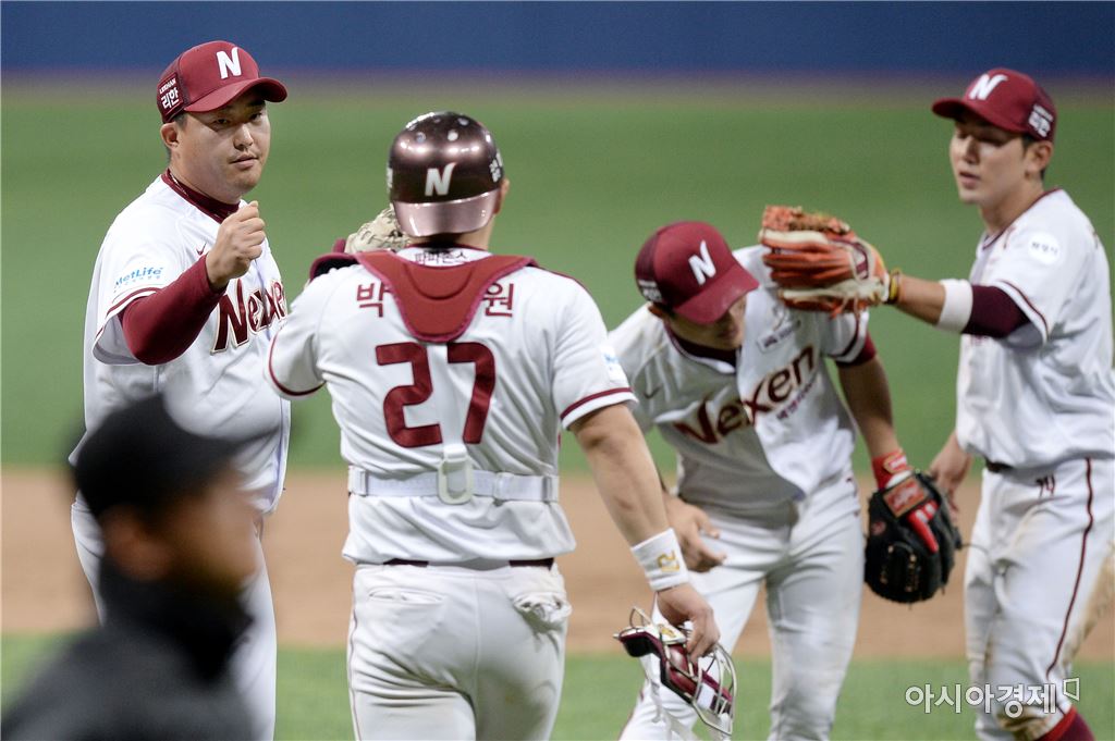[고척돔=아시아경제 김현민 기자] 프로야구 kt 위즈와 넥센 히어로즈의 2016 KBO리그 경기가 12일 서울 양천구 고척스카이돔에서 열렸다. 넥센 마무리 김세현이 5-2 승리를 확정한 뒤 박동원 포수와 하이파이브하고 있다. 김현민 기자 kimhyun81@asiae.co.kr<ⓒ세계를 보는 창 경제를 보는 눈, 아시아경제(www.asiae.co.kr) 무단전재 배포금지>