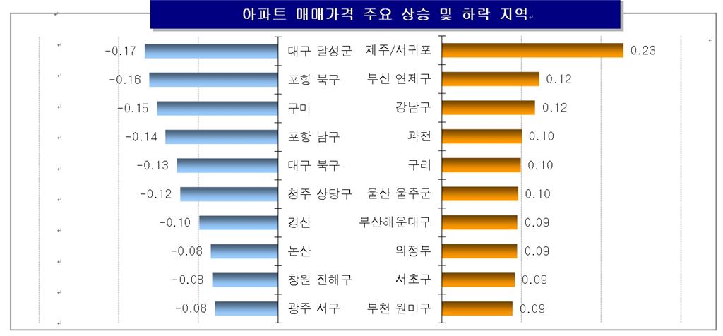 [아시아경제 조은임 기자]제주지역의 아파트값이 고공행진을 거듭하고 있다. 일주일새 매매·전세가격이 0.20%이상 올랐다. 일본·중국 등 해외 투자수요에 국내 이주수요까지 더해진 영향이다. 14일 KB국민은행에 따르면 전국의 아파트값은 전주대비 0.01% 상승했다. 정부의 대출규제 강화 영향으로 매매수요가 감소하였지만 수도권에서 중소형과 소형매물 위주로 실거래가 발생했기 때문이다. 제주·서귀포는 집값이 일주일새 큰폭으로 올랐다. 이지역의 아파트값이 전주대비 0.23% 오르면서다. 광역시를 제외한 지역이 3주연속 하락한 것과 크게 비교된다. 제주지역은 전세가격도 일주일새 0.20% 올랐다. 해외투자 수요가 이어지는데다 제2공항 건설도 호재로 작용했다. 임병철 KB국민은행 가치평가부 팀장은 "중국·일본 등 외국인 투자수요가 꾸준하고 제주에 세컨드 하우스를 짓거나 정착을 꿈꾸는 국내 이주수요도 계속해 증가하고 있다"고 설명했다. 서울은 매매가격이 강남(0.05%)과 강북(0.02%)이 모두 상승하며 0.03% 올랐다. 마포구는 인근 여의도 업무시설 관련 근로자수요 유입으로, 은평구는 코레일 수색역세권 개발, 카톨릭병원 개원 예정 등의 개발호재로 작용하며 0.07%씩 올랐다. 강남구(0.12%), 서초구(0.09%), 송파구(0.04%)는 개포주공2단지 재건축 관련 높은 분양가격과 거여동 2-1, 2-2구역 재개발 영향으로 투자수요 유입이 발생하며 상승했다.수도권(0.03%)은 소폭 상승한 반면, 5개 광역시는 보합을 기록했다. 대구(-0.08%)와 광주(-0.03%), 충북(-0.03%), 충남(-0.02%), 경북(-0.13%), 경남(-0.01%)은 하락했고, 부산(0.05%), 인천(0.03%), 울산(0.05%), 경기(0.03%), 강원(0.06%), 전북(0.01%), 전남(0.03%)은 상승했다. 대전과 세종은 보합(0.00%)을 나타냈다. 전국 아파트 전세가격은 0.02% 상승하며 장기간 오름세를 보였다. 저금리로 임대인의 월세선호가 심화되면서 수요대비 전세물량 부족현상이 지속되는 것으로 보인다. 서울 역시 강남(0.04%), 강북(0.05%)이 모두 상승하며 전주대비 0.04% 상승했다. 수도권(0.04%)과 5개 광역시(0.01%)도 상승세를 이어갔다. 기타지방은 대구(-0.09%), 경북(-0.05%), 광주(0.00%), 충북(0.00%), 충남(0.00%)을 제외하고는 모두 가격이 올라 4주연속 오름세를 보였다. 조은임 기자 goodnim@asiae.co.kr<ⓒ세계를 보는 창 경제를 보는 눈, 아시아경제(www.asiae.co.kr) 무단전재 배포금지>