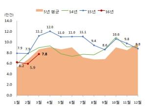 [아시아경제 주상돈 기자] 국토교통부는 3월 주택매매거래량이 7만7853건으로 전년 동월 대비 30.4% 감소했다고 14일 밝혔다. 전월(5만9265건) 보다는 31.4% 증가했으나 최근 5년 평균(8만6000건) 대비로는 9.9% 감소한 수치다.3월 누계기준으로는 19만9000건으로 전년 동기 대비 26.1% 줄었다. 최근 5년 평균(20만7000건) 대비로는 3.5% 감소했다.지역별로는 전년 동월 대비 수도권은 34.2%, 지방은 26.3% 감소하는 등 지방에 비해 수도권의 감소폭이 큰 것으로 나타났다. 3월 누계기준으로도 수도권은 26.1%, 지방은 26.2% 줄었다.유형별 거래량은 전년 동월 대비 아파트는 38.0%, 연립·다세대는 12.3%, 단독·다가구 주택은 11.3% 각각 감소했다. 3월 누계기준으로도 아파트는 34.7%, 연립·다세대는 5.2%, 단독·다가구는 2.5% 각각 줄었다.주택 매매거래량 및 실거래가 등에 대한 세부자료는 한국감정원 부동산통계시스템(www.r-one.co.kr, 부동산가격정보 애플리케이션) 또는 국토부 실거래가 공개 홈페이지(rt.molit.go.kr)에서에서 확인할 수 있다.주상돈 기자 don@asiae.co.kr<ⓒ세계를 보는 창 경제를 보는 눈, 아시아경제(www.asiae.co.kr) 무단전재 배포금지>