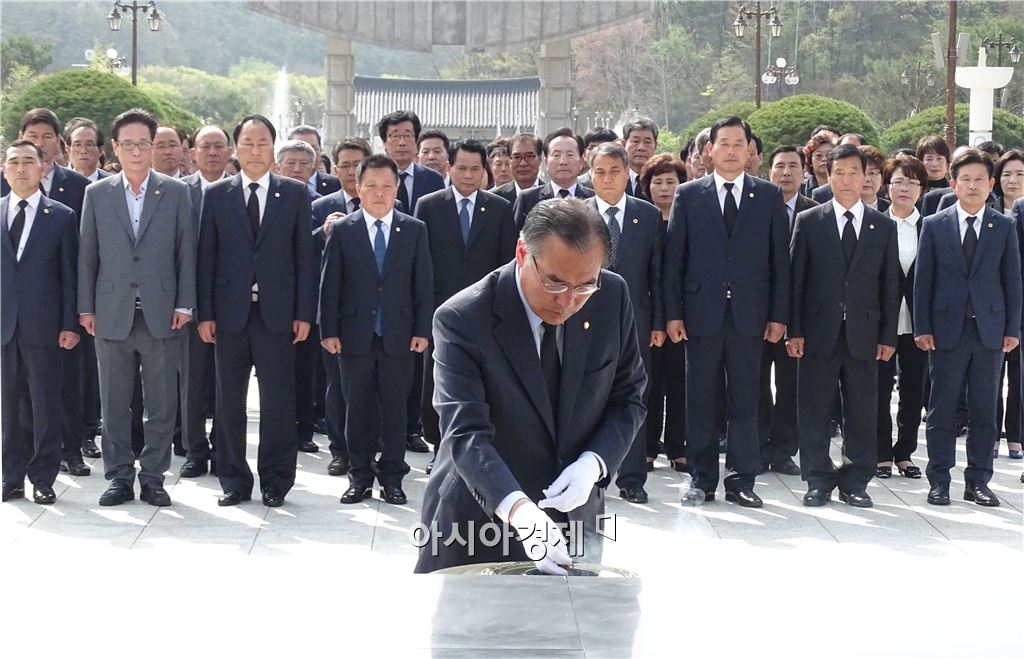 20대 총선 광주전남에서 녹색바람 돌풍으로 국민의당이 압승을 거두는 가운데 유일하게 살아남은 더민주 이개호(영광·함평·장성·담양) 당선인이 당직자들과 함께 14일 오전 5·18민주묘지를 참배하고 있다. 이개호 당선인은 방명록에 “오월 영령 뜻을 이어 정권교체 이룩하겠습다”라고 적었다. <br />