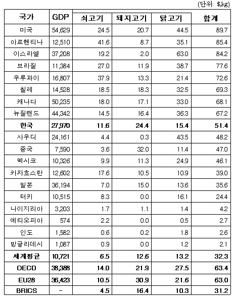 [아시아경제 오현길 기자] 우리 국민 한 사람이 한 해에 육류를 51.3㎏ 가량 소비하는 것으로 나타났다.15일 농림축산식품부에 따르면 2014년 기준으로 국민 1인당 육류소비량은 돼지고기가 24.3㎏, 닭고기 15.4㎏, 쇠고기 11.6㎏순으로 조사됐다.경제협력개발기구(OECD) 국가의 연간 1인당 육류소비량은 63.5kg으로, 닭고기 27.6㎏, 돼지고기 21.9㎏, 쇠고기 14.0㎏으로 집계됐다.OECD 평균 보다 육류 소비량이 약 12㎏ 가량 적으며, 닭고기와 쇠고기를 적게 먹는 대신 돼지고기를 많이 먹는 것으로 나타났다.연간 1인당 육류소비량이 가장 많은 국가는 미국으로 89.7㎏을 먹는 것으로 조사됐으며, 아르헨티나(85.4㎏), 이스라엘(84.2㎏) 순이었다.반면 육류 소비가 가장 적은 국가는 연간 2.1㎏을 기록한 방글라데시이며, 인도(2.6㎏), 에티오피아(2.8㎏)가 그 뒤를 이었다.육류소비량이 가장 많은 미국은 가장 적은 방글라데시보다 약 43배 많은 육류를 소비하는 셈이다.품목별로 쇠고기 소비량이 많은 국가는 아르헨티나(41.6㎏), 우루과이(38.0㎏), 브라질(27.0㎏)로 조사됐다.돼지고기 소비량이 많은 국가는 중국(32.0㎏), 유럽연합(EU, 30.9㎏), 베트남(28.8㎏) 순, 닭고기 소비량이 많은 국가는 이스라엘(63.0㎏), 미국(44.5㎏), 사우디아라비아(43.5㎏) 순이다.세계적으로 소가 가장 많은 두 나라는 인도와 아르헨티나로, 인도는 도축을 전혀 하지 않아서 개체수가 많은 것인 반면 아르헨티나는 쇠고기를 주식으로 소비해 사육도 많이 하기 때문이라고 설명했다.이스라엘은 닭고기 소비량이 많은데 유대인들이 종교적인 이유(코셔)로 돼지고기를 소비하지 않기 때문이며 사우디도 마찬가지로 종교적인 이유(할랄)로 닭고기 소비량이 많은 것으로 보인다.중국은 세계 육류소비량의 31.2%를 차지하고 있으며, 육류소비량 상위 1~5위 국가인 중국, EU, 미국, 브라질, 러시아가 차지하는 비중이 71.6%에 달할 정도로 육류소비가 편중된 것으로 확인됐다.농식품부는 선진국일수록 전체 육류소비량은 많아지며 품목별로 닭고기, 쇠고기의 소비량은 많아지고 돼지고기의 소비량은 낮아진다고 설명했다. 건강에 대한 관심 등으로 소비자의 백색육 선호가 높아지기 때문으로 보인다.