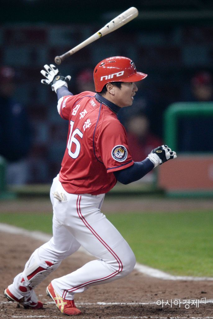[인천=아시아경제 김현민 기자] 프로야구 KIA 타이거즈와 SK 와이번스의 2016 KBO리그 경기가 14일 인천 문학구장에서 열렸다. 7회초 2사 만루에서 KIA 김주찬이 추가 2타점 적시타를 치고 있다. 김현민 기자 kimhyun81@asiae.co.kr<ⓒ세계를 보는 창 경제를 보는 눈, 아시아경제(www.asiae.co.kr) 무단전재 배포금지>