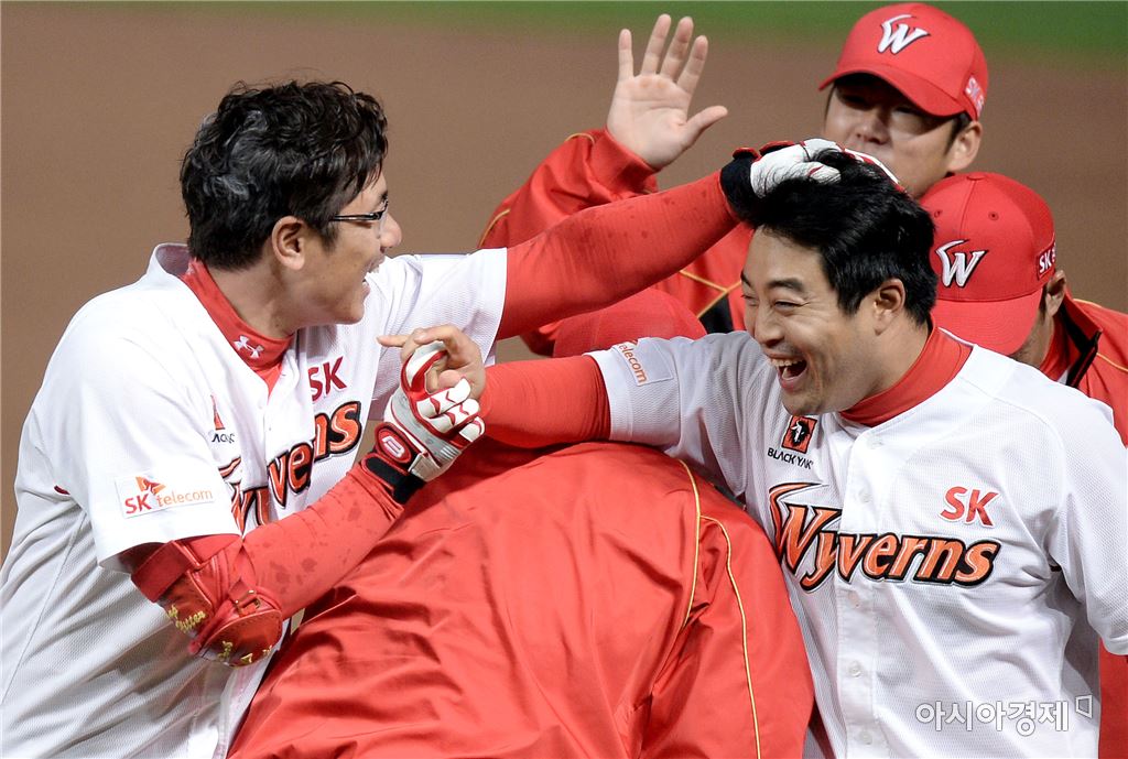[인천=아시아경제 김현민 기자] 프로야구 KIA 타이거즈와 SK 와이번스의 2016 KBO리그 경기가 14일 인천 문학구장에서 열렸다. 9회말 1사 1,2루에서 SK 박정권이 좌익수 키를 넘기는 끝내기 안타를 치고 정의윤과 기뻐하고 있다. 김현민 기자 kimhyun81@asiae.co.kr<ⓒ세계를 보는 창 경제를 보는 눈, 아시아경제(www.asiae.co.kr) 무단전재 배포금지>