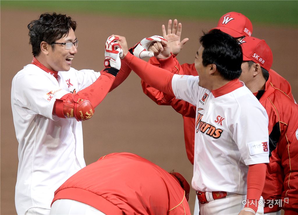 [인천=아시아경제 김현민 기자] 프로야구 KIA 타이거즈와 SK 와이번스의 2016 KBO리그 경기가 14일 인천 문학구장에서 열렸다. 9회말 1사 1,2루에서 SK 박정권이 좌익수 키를 넘기는 끝내기 안타를 치고 동료들과 기뻐하고 있다. 김현민 기자 kimhyun81@asiae.co.kr<ⓒ세계를 보는 창 경제를 보는 눈, 아시아경제(www.asiae.co.kr) 무단전재 배포금지>