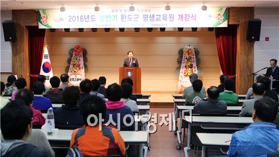 "100세 시대! 평생교육과 함께" [아시아경제 노해섭 기자]완도군(군수 신우철)은 지난 12일 100세 시대를 맞이해 평생학습관 제막식과 상반기 평생교육원 개강식을 가졌다. 이날 개강식에는 전남대학교 평생교육원 김회수 원장, 목포대학교 평생교육원 박정희 원장이 참석해 상반기 평생교육원 개강을 축하했다. 신우철 완도군수는 “남보다 먼저 배우고! 끊임없이 배우고! 배운 것을 나누는 행복을 아는 사람이 진정한 100세 청춘”이라며 군민들의 평생교육 참여를 당부했다. 완도군은 도서로 형성되어 있는 지역 실정에 맞춰 강사를 도서읍면에 파견하고, 농어업 등 생업에 바쁜 군민들을 위해 야간에 강좌를 개설해 운영하는 등 맞춤형 평생교육을 실천하고 있다. 군은 이번에 개관한 평생학습관이 14년 전통의 완도군 평생교육의 랜드마크로 자리매김 할 것으로 기대하고 있으며, 올해 11개 읍면에 17개 과정 48개 반을 개설해 운영한다.노해섭 기자 nogary@<ⓒ세계를 보는 창 경제를 보는 눈, 아시아경제(www.asiae.co.kr) 무단전재 배포금지>