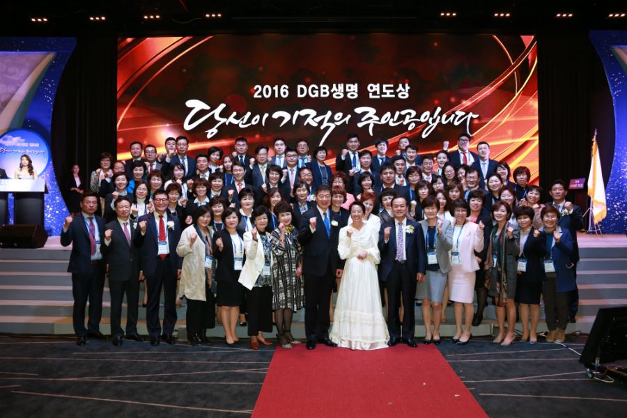 14일 인천 네스트 호텔에서 열린 2016 연도상 시상식에서 오익환 DGB생명 사장을 비롯한 수상자들이 기념 촬영을 하고 있다. <br />