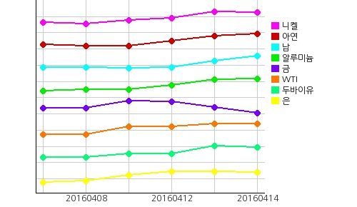 국제 원자재 시장에서 WTI(서부텍사스산원유)의 현물시세가 전일 대비 0.26 달러 떨어진 배럴당 41.5 달러를 기록했고, 두바이유 현물시세는 전일 대비 0.45 달러 떨어진 배럴당 39.66 달러를 기록했다.금 현물시세는 전일 대비 14.71 달러 떨어진 온스당 1227.84 달러를 기록했고, 은 현물시세도 전일 대비 0.05 달러 떨어진 온스당 16.16 달러를 기록했다.주요광물시세는 니켈이 전일 대비 톤당 38 달러 떨어져 8880 달러를 기록하는 반면, 납이 전일 대비 톤당 24 달러 올라 1740.35 달러를 기록했고 아연, 주석, 알루미늄 모두 상승세를 보였다.환율