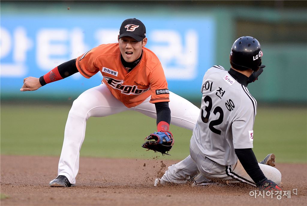 [대전=아시아경제 김현민 기자] 프로야구 LG 트윈스와 한화 이글스의 2016 KBO리그 경기가 15일 대전구장에서 열렸다. 1회초 2사 1루에서 LG 이병규(7번) 타석 때 1루주자 이천웅이 2루 도루에 성공하고 있다. 한화 유격수는 하주석.김현민 기자 kimhyun81@asiae.co.kr<ⓒ세계를 보는 창 경제를 보는 눈, 아시아경제(www.asiae.co.kr) 무단전재 배포금지>
