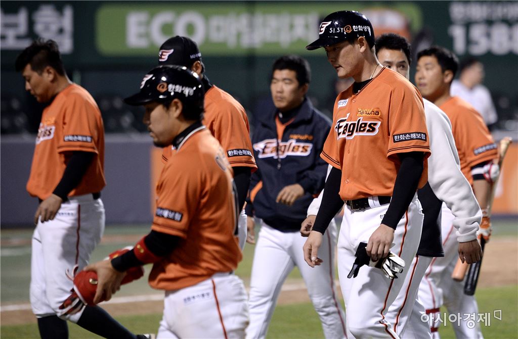 [대전=아시아경제 김현민 기자] 프로야구 LG 트윈스와 한화 이글스의 2016 KBO리그 경기가 15일 대전구장에서 열렸다. 2-18로 진 한화 선수들이 그라운드를 나서고 있다. 김현민 기자 kimhyun81@asiae.co.kr<ⓒ세계를 보는 창 경제를 보는 눈, 아시아경제(www.asiae.co.kr) 무단전재 배포금지>